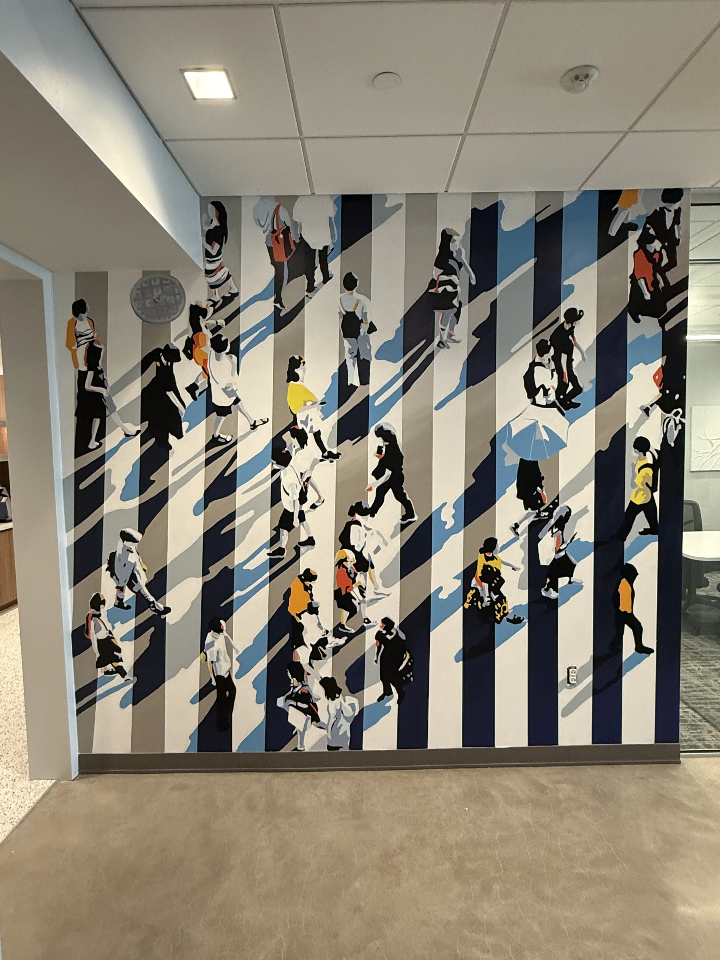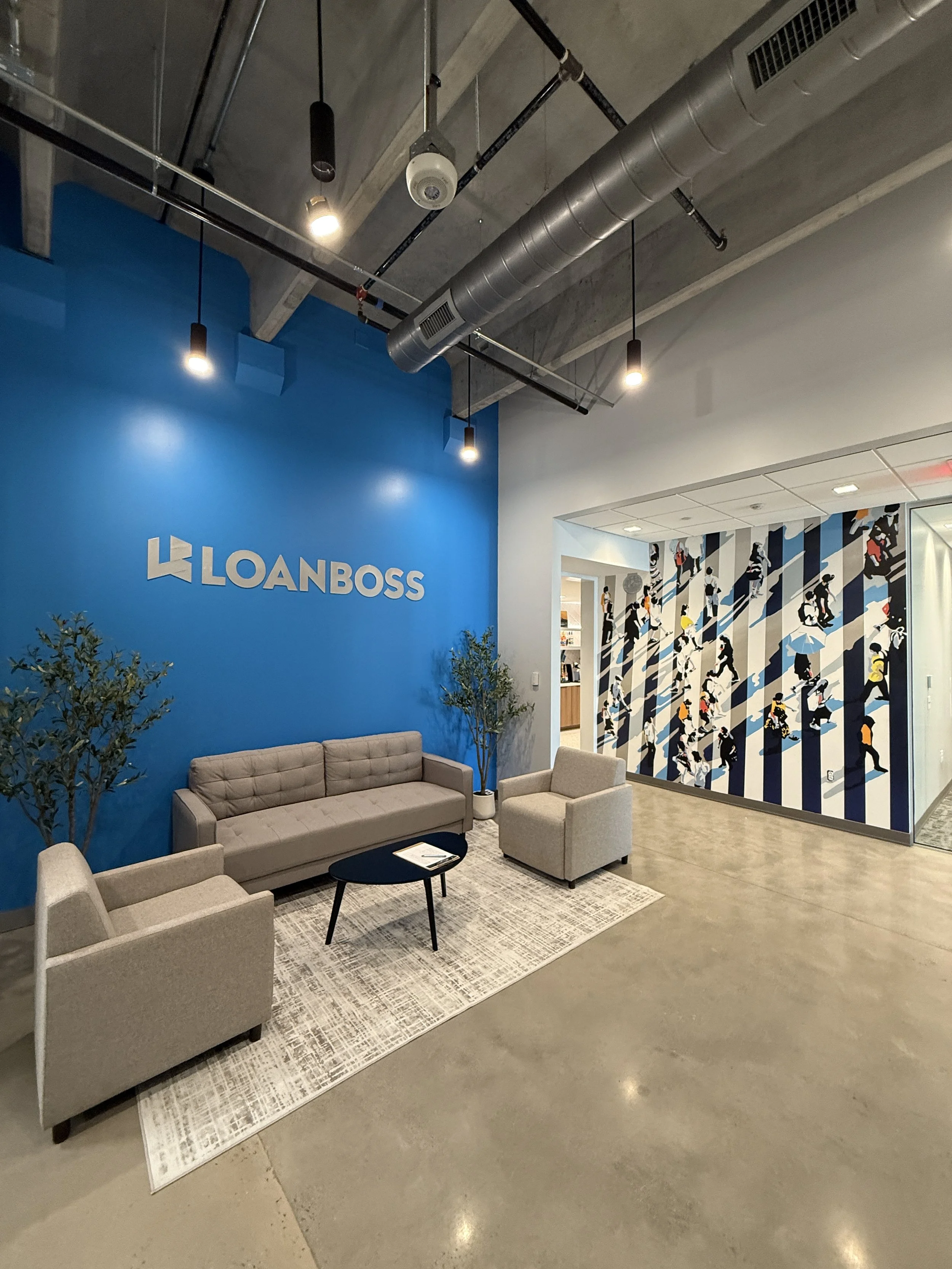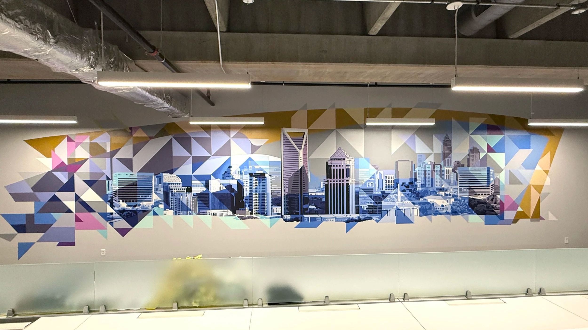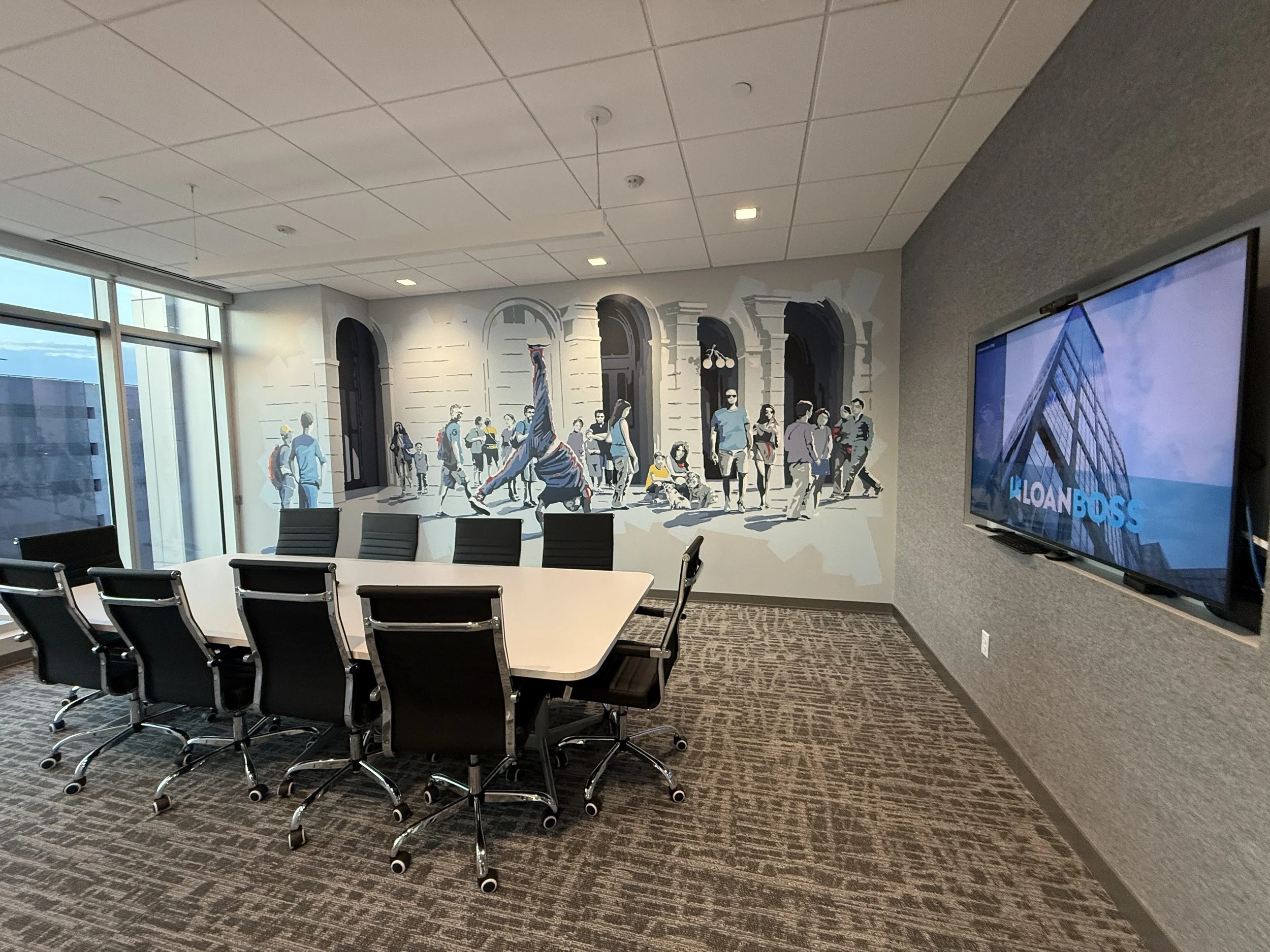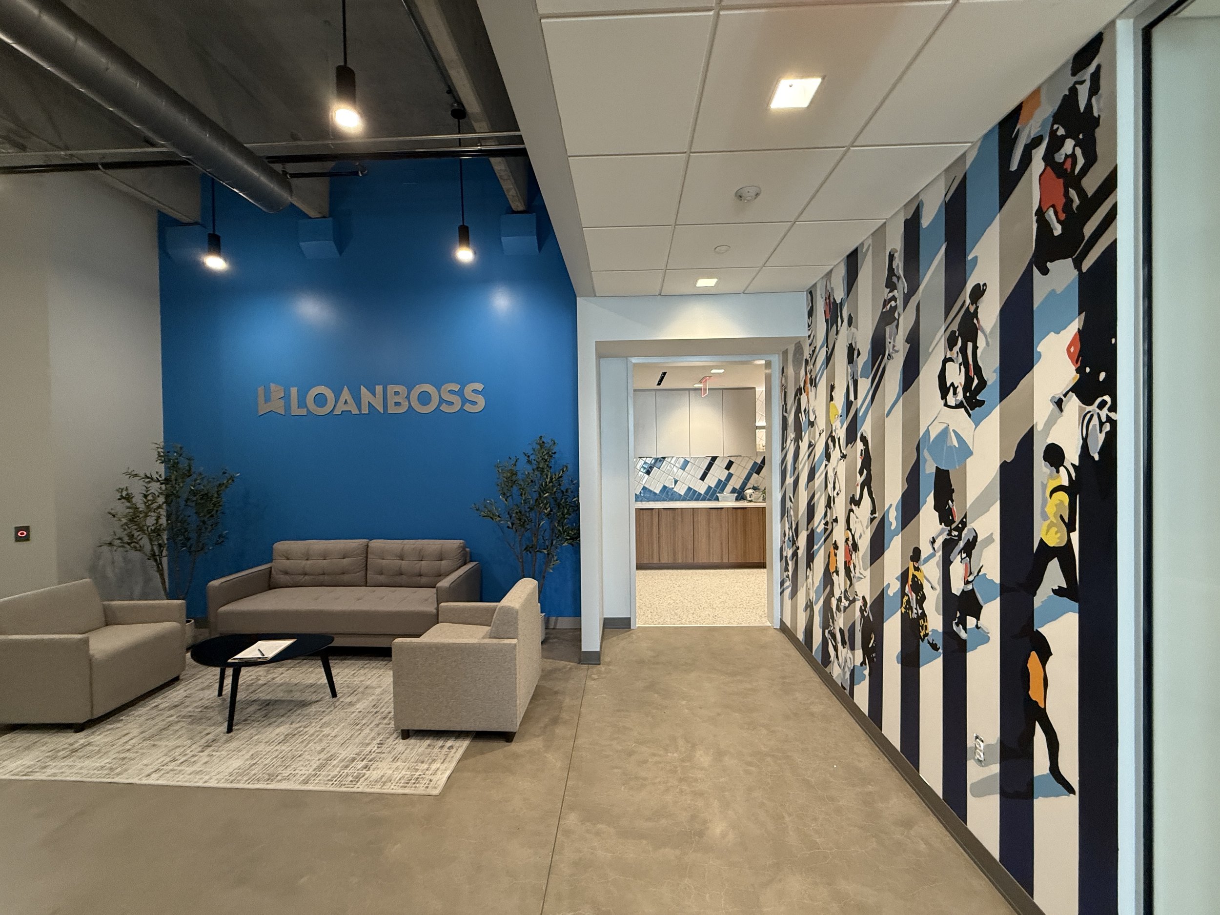 Three murals inside the offices of LoanBoss in LoSo, Charlotte. Each wall has a unique voice, reflecting a sense of the local, teamwork and collaboration.